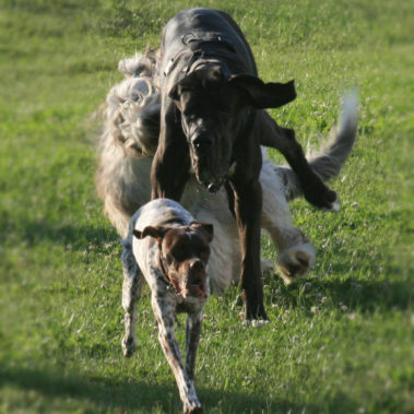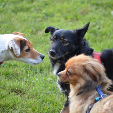 Wir passen auf und schreiten gegebenenfalls auch ein, wenn es Unstimmigkeiten gibt, wenn ein Hund zu sehr bedrängt oder wenn es einem Hund schlichtweg zu viel wird.